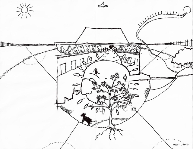The sketch depicts what I’ve been calling “Heruka’s Mandala”… It’s full of my personal interpretation of a classic Tibetan Buddhist meditation visualization, used in prayers for creating a “perfect” world.