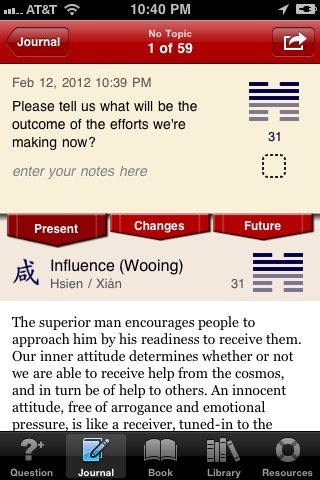 We get this hexagram when we are about to be attacked by negative influences, either as external events resulting from our vulnerability, or as negative thoughts. If our attitude is persevering, our response will be correct; if not, the pressure of the moment will cause these negative elements to surface and spoil our relationships.