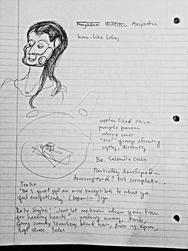Sketch of Anjaska with crystal globe at jaw & dark armor-like casing at jaw and neck; diagram of healing/rejuvenation/adjustment table; conversation between Bo and Sujira about emotional healing.