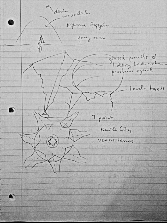 Diagrams of underwater bubble/cavern city; 7-pointed star layout with temple in city center; triangular panels of glass-like material that hold back water; young man on bipedal vehicle (like Mary Isabel saw?) coming out of one of 7 dark purple cavern entryways into city;
