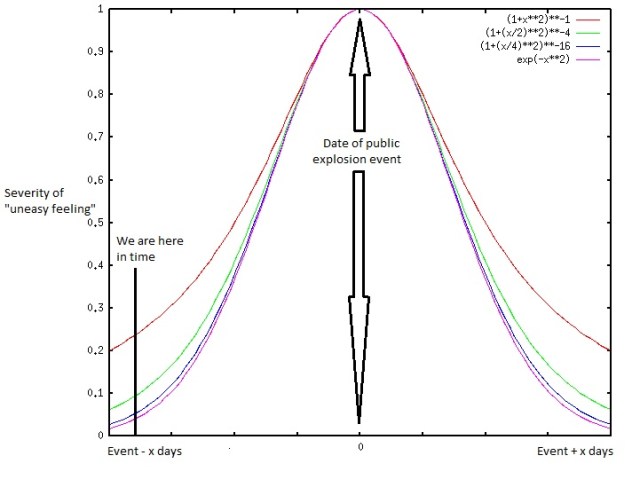 For discussion purposes only, consider the period of time the population is deeply affected by a explosive public event is 6 months. Perhaps 6 months will be how far back in time that emotions will ripple and still be felt. It was several months before 9/11 that other friends and myself felt something was wrong, feeling much the same way we do now. Perhaps the magnitude of the “uneasy effect” is related to the magnitude of the coming event.