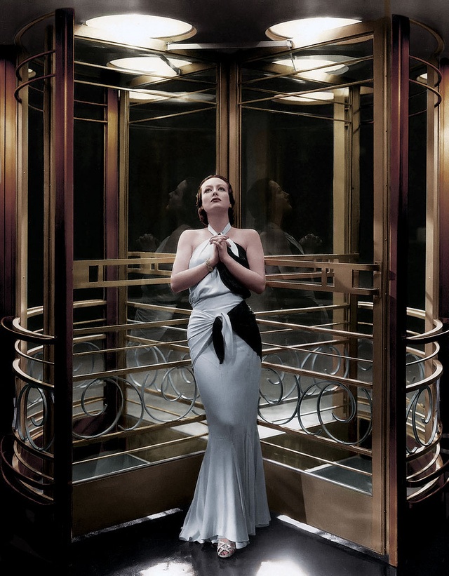 I think this is one of my new “favorite” images. 🙂 yin/yang dress – revolving door of reincarnation – reflections of different dimensions in the windows – even the “colorized” version being reminiscent of the movie the wizard of oz. I also appreciate the 1930’s design. Everything about this composition is “perfect”.