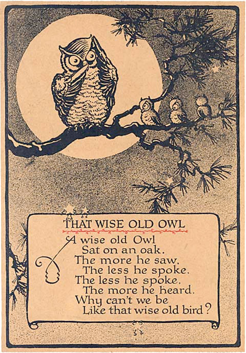 4. I should also say, my intent here is not to tell anyone to “keep quiet”! I was recently reminded of a “wise old owl” poster that my grandparents had in their house – the owl was different from the one here, but the poem was the same. This is advice I’ve carried close to my heart for many years. 🙂