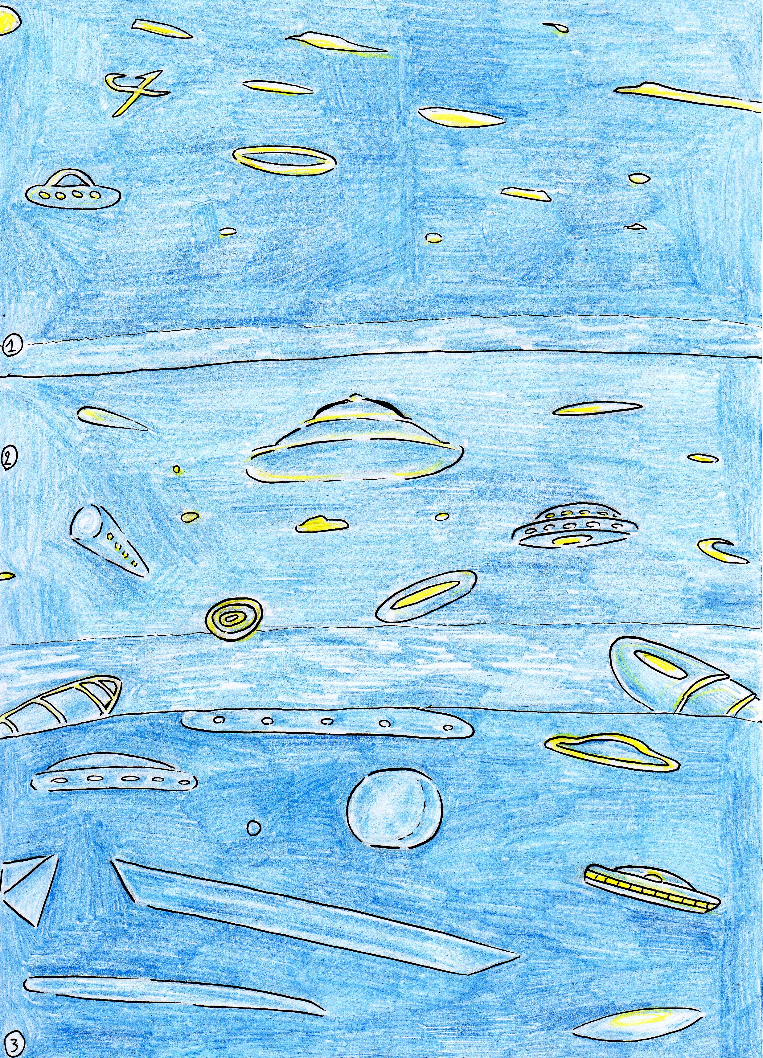 Among other people, my sister was there with me and all of a sudden we all see a fleet of a really huge number of ships and long cigar shaped motherships. They had different sizes, some looked like symbols, and all seemed to be like light yellow moving objects having also the deep blue color of the environment that was reflected on their ‘metal’ surfaces.