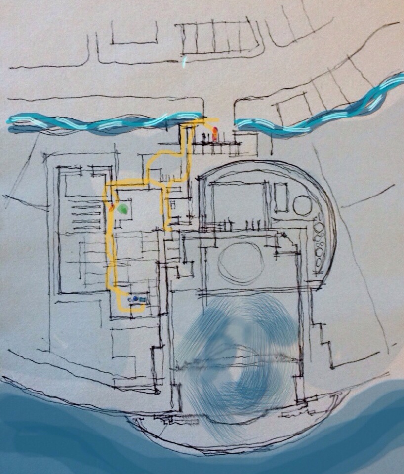 But “behind” the garage, the building continued on and on… And as I sketched I sensed huge spaces and thick walls and curved boundaries… Air locks and gaskets and vertical shafts, thick many-layered walls… Could be Heruka’s mansion, or a “ship”…
