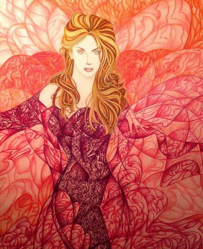 Right through you…wearing a reddish dress,