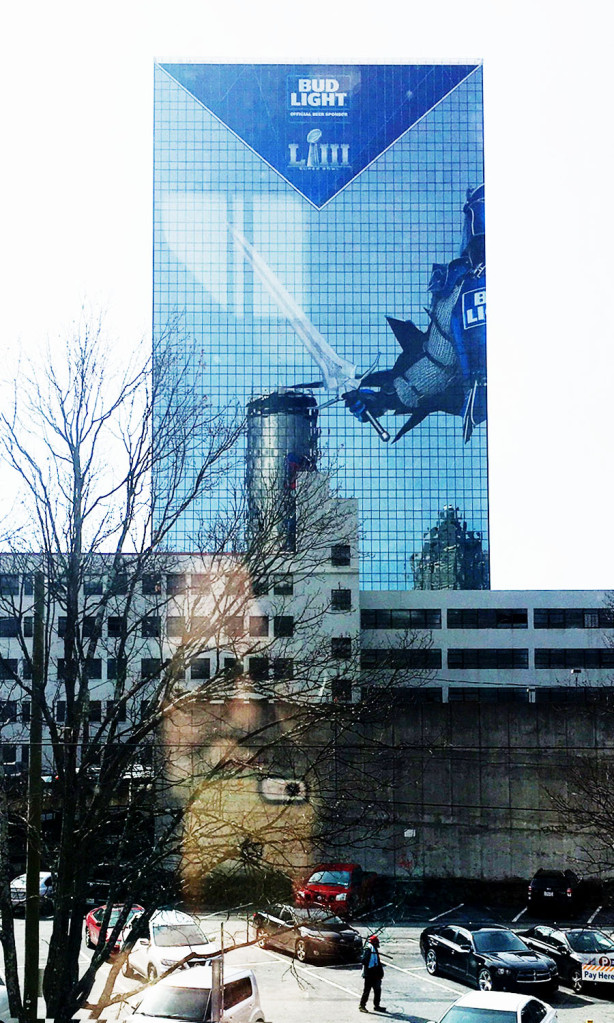 Why anyone thinks it’s a good idea to plaster a 30-floor tall medieval-knight-type guy with a sword and Bud-Light robes onto an office building 3 blocks from the action is beyond me.