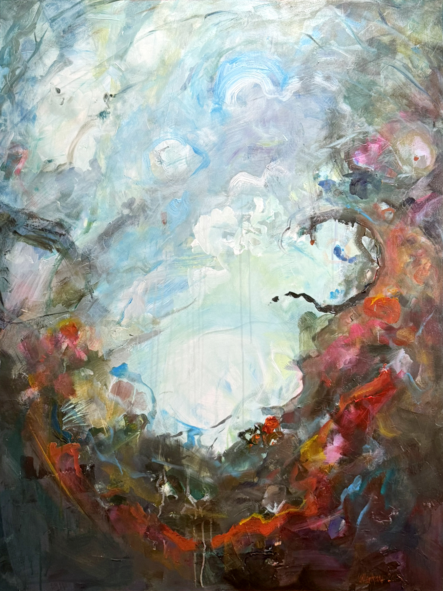 Today I’m sharing a recent painting, titled “Respawn.” Inspired by my gaming and the Buddhist concept of rebirth, it expresses the metamorphosis we forge when we keep going, keep starting over, and spring anew from the ashes of our inner battles. This piece covers the range of emotions I brought to the canvas that day: fiery determination, blissful inspiration, and meditative peace.
