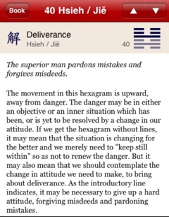 Second line changing: “…several obstacles still block, but you are in a strong position and are capable of attending to them yourself, even though you can call on a person of authority if you need it. (Dignity + Moderation) + Integrity => Good Fortune.