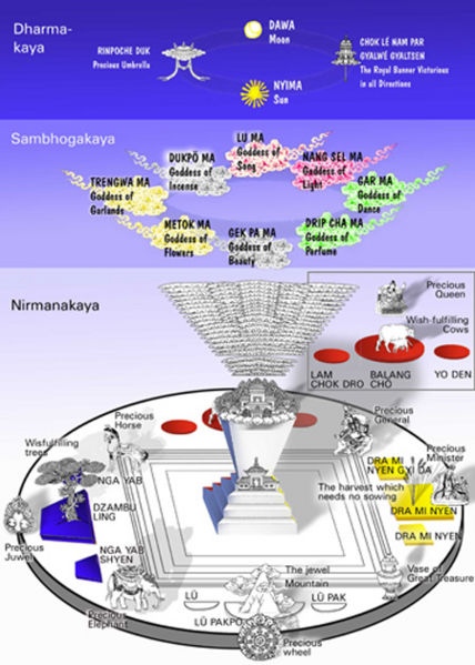The Mandala Offering depicts components of the Tibetan Buddhist cosmology, as illustrated here, from the Berzin Archive (this image uses Tibetan terminology; Sanskrit may also be used.):