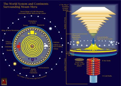 Mount Meru diagram from sharemyattitude.blogspot.com, which includes the heavens above and the hells below.