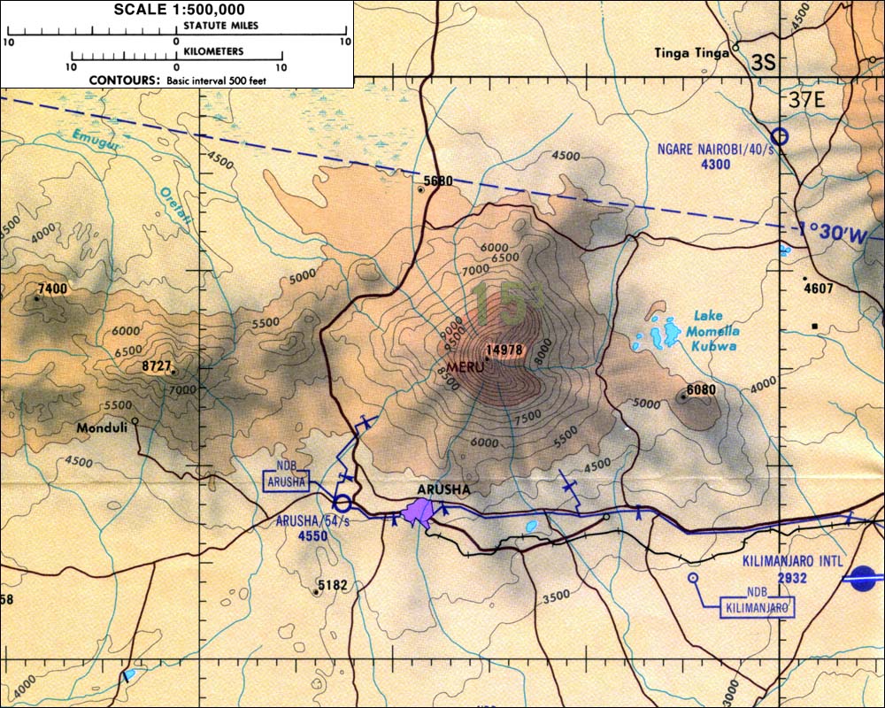 The Ski Mountaineer website offers this map of Mount Meru in Tanzania, near Kenya and Kilimanjaro: