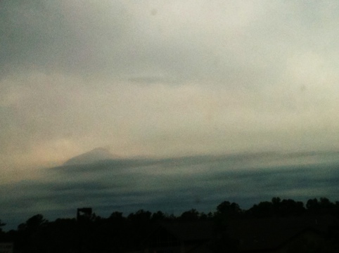 This first photo was from this morning; the dark “peak” just above the trees in the center is a bank of clouds that looked like and entire continent, with a mountain…